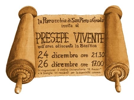 Il presepe vivente nacque a San Piero a Grado nel 1997, come semplice rappresentazione della nascita di Gesù raccontata con i versi di Gozzano, per volere del parroco Don Mario Stefanini e della comunità. Una tradizione cristiana che consiste in una breve rappresentazione teatrale con lo scopo di raccontare la nascita di Gesù utilizzando scenografie che ricreino l’ambientazione della natività. Il primo presepe vivente della storia è attribuito a San Francesco d’Assisi, nel borgo di Greccio (Rieti) nel 1223. La tradizione si è poi diffusa in tutt’Italia e in altri Paesi cristiani, e i figuranti sono solitamente gli abitanti del posto.