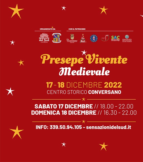 Il Presepe Vivente Medievale si inserisce all’interno di un percorso già avviato dall’associazione SensAzioni del Sud con l’evento di rievocazione storica LE NOTTI DELLA CONTEA che si tiene ogni anno ad agosto a Conversano.