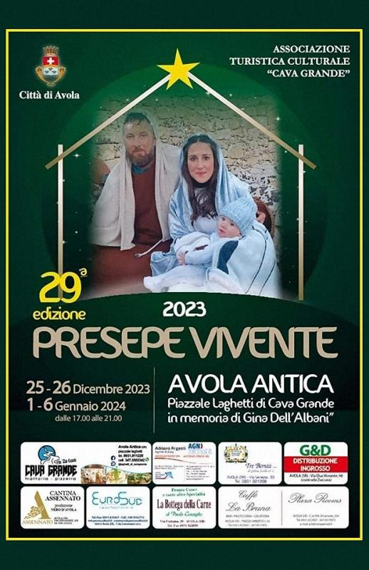 Presso il Piazzale Laghetti di Cava Grande ad Avola in provincia di Siracusa si svolge nei giorni 25-26 Dicembre 2023 e 01-06 Gennaio 2024, dalle ore 17.00 alle ore 21.00, la 29a Edizione del Presepe Vivente.