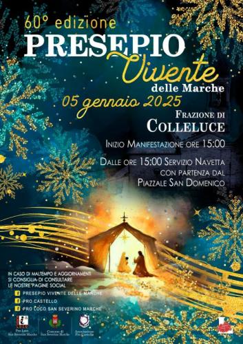 Domenica 5 Gennaio 2025 dalle ore 15:00 alle 18:00 l'associazione Pro Castello Vi invita a partecipare alla 60esima edizione del Presepe Vivente delle Marche organizzato in collaborazione con il Comune di San Severino Marche, la Pro Loco di San Severino Marche e con la partecipazione delle associazioni di promozione sociale e di volontariato del Comune.L'evento si svolgerà nella stupenda cornice della frazione di Colleluce.È previsto il servizio di navetta gratuito con partenza dal piazzale antistante la Chiesa di San Domenico.In caso di maltempo e aggiornamenti si consiglia di consultare le nostre pagine social.