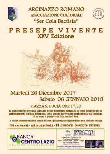 La XXV edizione del Presepe Vivente ad Arcinazzo Romano si tiene nei giorni 26 dicembre 2017 e 6 gennaio 2018, alle ore 17.30 in piazza Santa Lucia.