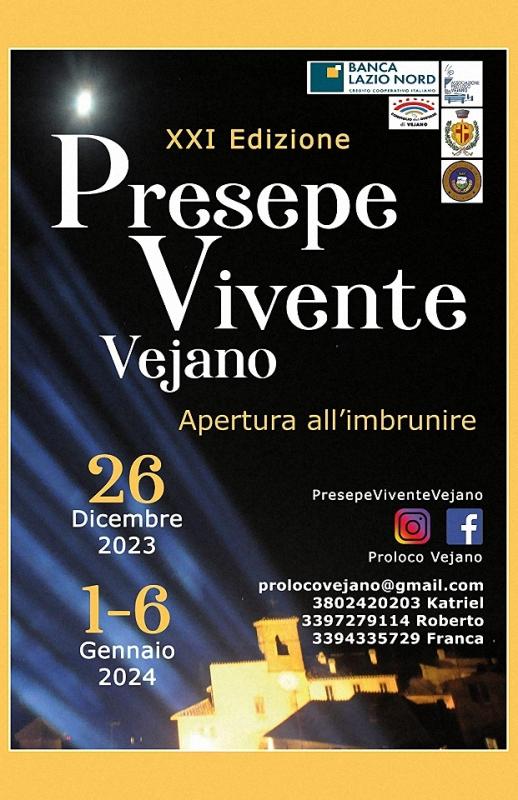 Nei giorni 26 Dicembre 2023 e 01 e 06 Gennaio 2023 si svolge la 21a edizione del Presepe vivente di Vejano.