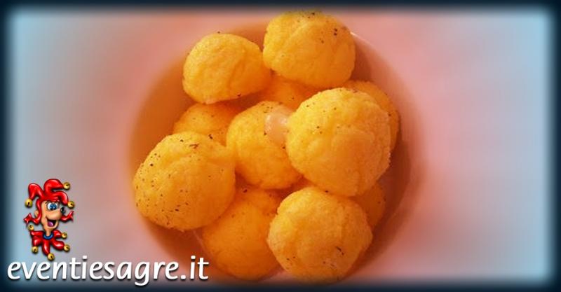 Prendere una porzione di polenta calda alla volta e lavorarla fino ad ottenere una palla al cui interno si metterà un pezzetto di formaggio salato, circa 40 o 50 grammi.