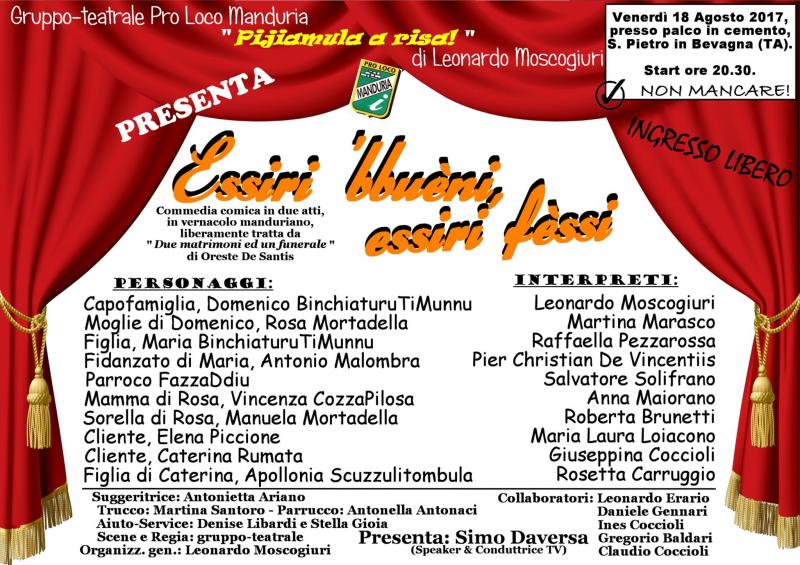 Il gruppo teatrale Pro Loco Manduria " Pijiamula a risa" di Leonardo Moscogiuri torna ancora una volta in scena con un nuovo e decimo lavoro!Una commedia comica in due atti, in vernacolo manduriano liberamente tratta da "Due Matrimoni e un funerale" di Oreste De Santis; presenta la bravissima Simona Daversa nota speaker e conduttrice tv.