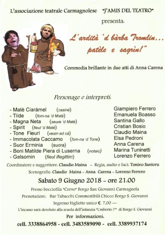 L’Associazione Teatrale J’Amis del Teatro di Carmagnola, debutta sabato 9 giugno 2018 alle ore 21 nei locali della bocciofila “Cervo” di Borgo S.Giovanni, con la nuova commedia in piemontese: