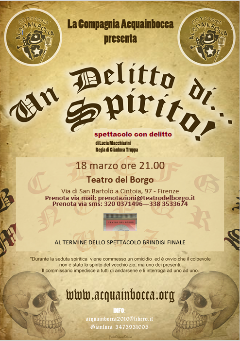 La Compagnia Acquainbocca presenta Un delitto di... spirito!, uno spettacolo con delitto e brindisi finale (alla faccia del morto!).