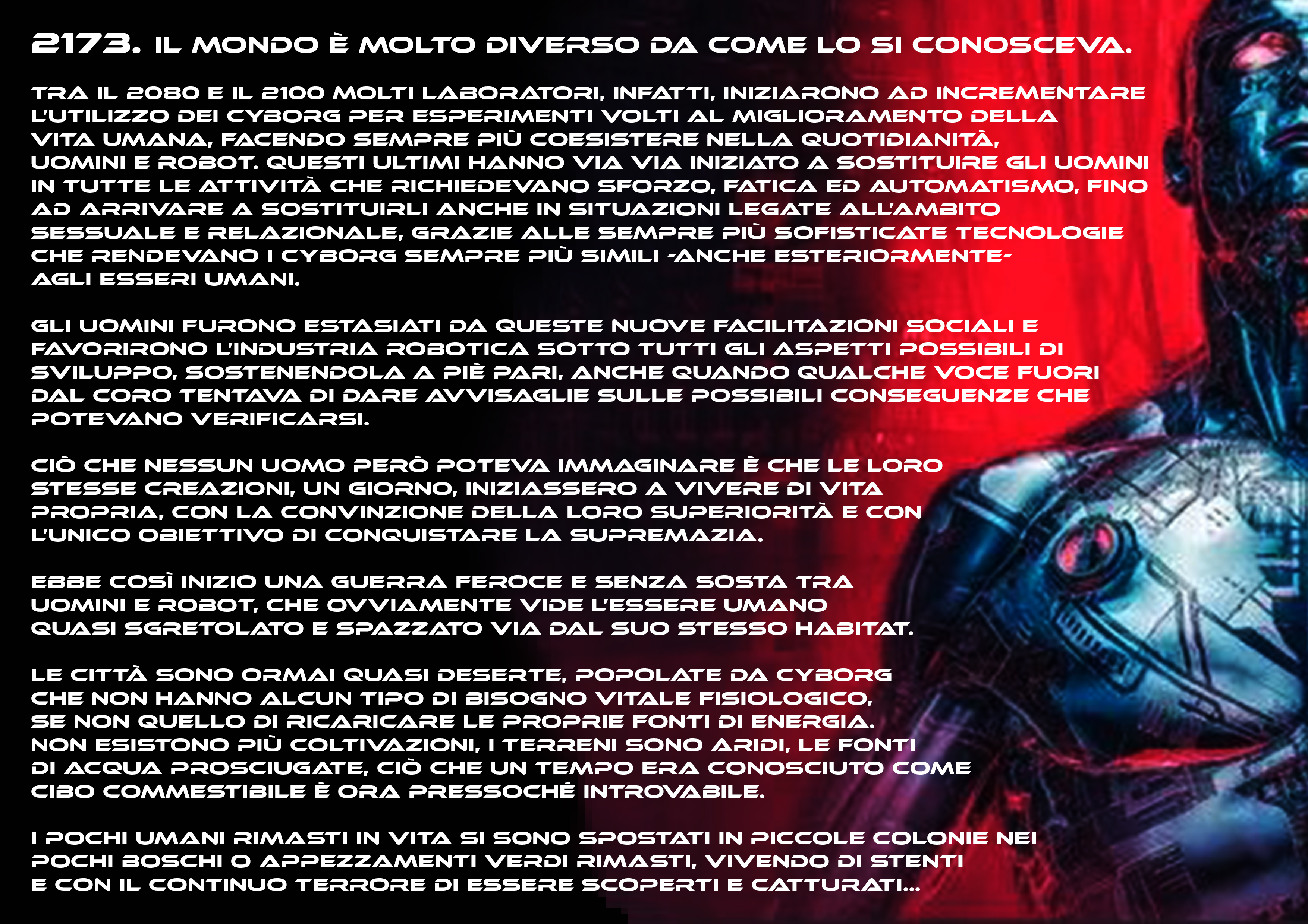 Gli Uomini furono estasiati da queste nuove facilitazioni sociali e favorirono l’Industria Robotica sotto tutti gli aspetti possibili di sviluppo, sostenendola a piè pari, anche quando qualche voce fuori dal coro tentava di dare avvisaglie sulle possibili conseguenze che potevano verificarsi. ciò che nessun uomo però poteva immaginare è che le loro stesse creazioni, un giorno, iniziassero a vivere di vita propria, con la convinzione della loro superiorità e con l’unico obiettivo di conquistare la supremazia. ebbe così inizio una guerra feroce e senza sosta tra uomini e robot, che ovviamente vide l’essere umano quasi sgretolato e spazzato via dal suo stesso habitat. le città sono ormai quasi deserte, popolate da cyborg che non hanno alcun tipo di bisogno vitale fisiologico, se non quello di ricaricare le proprie fonti di energia. non esistono più coltivazioni, i terreni sono aridi, le fonti di acqua prosciugate, ciò che un tempo era conosciuto come cibo commestibile è ora pressoché introvabile. i pochi umani rimasti in vita si sono spostati in piccole colonie nei pochi boschi o appezzamenti verdi rimasti, vivendo di stenti e con il continuo terrore di essere scoperti e catturati...