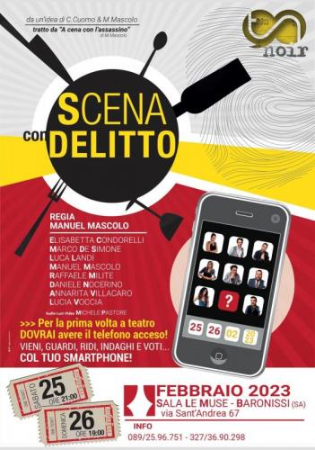 “Scena con delitto” è una produzione TeatroNovanta; la regia è di Manuel Mascolo che è anche autore del testo. In scena lo stesso Mascolo, Lucia Voccia, Marco de Simone, Raffaele Milite, Daniele Nocerino, Luca Landi, Elisabetta Condorelli, Annarita Villacaro e Luca Landi. Audio, luci e video di Michele Pastore.