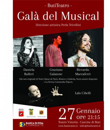 Il Galà del Musical” è un’emozionante viaggio tra i maggiori successi del musical italiano e internazionale, diretto da Perla Trivellini. Vedrà 4 grandi artisti di fama nazionale cantare le più belle canzoni tratte dai musical che hanno fatto la storia del teatro.Saliranno sul palco del Teatro Vittoria Graziano Galatone (Febo in Notre Dame de Paris di Riccardo Cocciante), Lalo Cibelli (Virgilio nell’opera “la Divina Commedia l’Opera” e “Spoletta” in Tosca Amore Disperato di Lucio Dalla), Riccardo Maccaferri (Gringoire in Notre dame de Paris di Riccardo Cocciante e “Benvolio” nel musical “Romeo e Giulietta Ama e cambia il Mondo” di Gérard Presgurvic) e Daniela Bulleri (Piccarda in “La Divina Commedia l’Opera”).