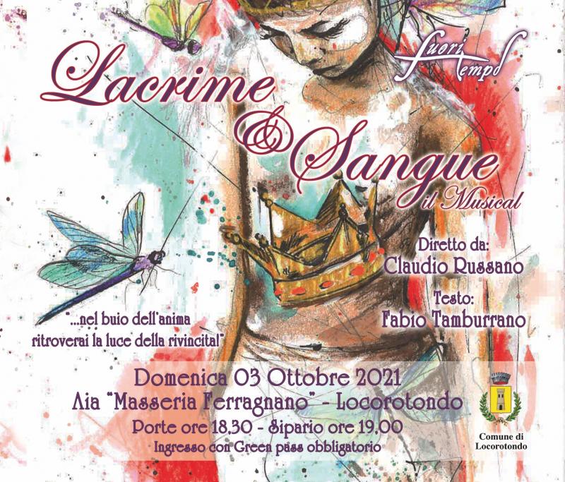 Dopo il grande successo di pubblico e critica, che gli ha visti in scena lo scorso 06 agosto, presso l’Atrio dell’Ateneo Bruni di Martina Franca,La Compagnia Teatrale “Fuori Tempo” di Martina Franca, replica con lo spettacolo musicale “LACRIME & SANGUE” con i Testi di Fabio Tamburrano. Diretto dal Regista Claudio Russano, e con le coreografie del Maestro Francesco Tinelli, e la direzione musicale della Maestra Miriana Lacarbonara, torna in scena domenica 03 ottobre, presso la Masseria “FERRAGNANO” a Locorotondo (Ba), ha una trama profonda, un’orchestrazione sottile del tempo che farà da filtro al fascino teatrale, lasciando intendere che il teatro, è un mezzo potente, la sua funzione civile è importate, come atto di denuncia e mezzo d’informazione. Il teatro invita a riflettere su argomenti difficili attraverso l’emozione, pone delle domande e invita a dubitare.