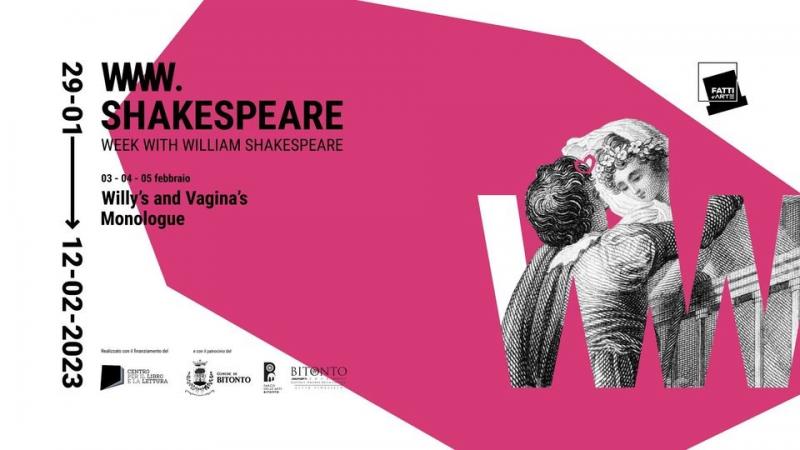 www.Shakespeare, week with william Shakespeare è il festival ideato e diretto dalla compagnia Fatti d’Arte e sostenuto dal Comune di Bitonto. L’intera cittadinanza è coinvolta da nove anni in questa full immersion nel nome del drammaturgo inglese, un'azione che unisce lo spettacolo dal vivo alla formazione del pubblico e che in questa edizione speciale, in programma dal 29 gennaio al 5 febbraio, ospita nella città di Bitonto performance, spettacoli dal vivo e azioni multidisciplinari, la nuova produzione della Compagnia Fatti d’Arte Willy’s and Vagina’s Monologue al Teatro Traetta di Bitonto (3,4 e 5 febbraio) e, come evento speciale, fuori dalla settimana shakespeariana: lo spettacolo Con la Carabina che è valso due premi Ubu alla Compagnia Licia Lanera (12 febbraio).