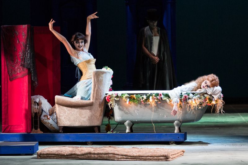 Rafforza l’idea già assai intrigante l’aver assegnato la regia dell’opera agli stessi autori dell’edizione in prosa: Carlo Sala ha avuto l’incarico di adattare la sua scena del Sogno in prosa alle ben diverse esigenze della regia d’opera ideata da me e da Ferdinando Bruni. La scena compatibile, pur assai modificata, è anche una esigenza – meritevole – di sostenibilità economica e logistica, viste le rapide alternanze prosa-opera. Da un lato questa esigenza non ha affatto limitato la fantasia di noi artisti, visto che abbiamo potuto andare a rovistare in soffitta, ovvero nei magazzini di ben tre teatri (Teatro Ponchielli, Teatro dell’Elfo e Teatro alla Scala) per dare il massimo fulgore visivo ai due diversi allestimenti, come il Sogno richiede, pur partendo dal celebre impianto del grande arco barocco blu elettrico del Sogno dell’Elfo, illuminato, sia in prosa che in lirica, dalla mano sapiente di Nando Frigerio.