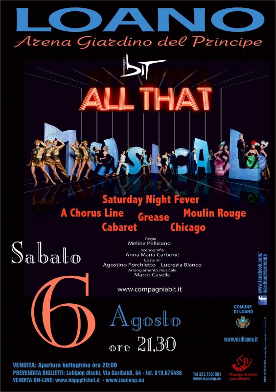 Sabato 6 agosto, ore 21.30 a Loano, presso l'Arena Giardino Del Principe, Compagnia Bit e Equipe Eventi presentano All That Musical: Grease, La febbre del Sabato Sera, Mamma Mia!, Moulin Rouge, A chorus Line, Cabaret, Chicago, Notre Dame de Paris, Cats, The Phantom the Opera
