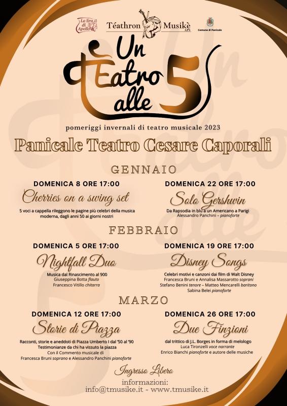 Far vivere il teatro Caporali di Panicale anche d’inverno con una stagione di concerti e teatro musicale tra gennaio e marzo. È questa l’idea da cui è partita la nuova iniziativa dell’associazione culturale TéathronMusikè, ‘Un tèatro alle 5’, cartellone di grande qualità artistica, con sei appuntamenti a ingresso libero, il cui primo sarà domenica 8 gennaio. Ospiti di questa prima data saranno i Cherries On A Swing Set. “Uno dei più importanti gruppi vocali italiani – spiegano gli organizzatori –, quintetto a cappella, già vincitore di numerosi premi e regolarmente ospite di festival italiani e internazionali. Durante l’esibizione al teatro Caporali i Cherries On A Swing Set rileggeranno, nei loro arrangiamenti originali, il meglio della musica moderna degli ultimi 70 anni, dal pop al jazz, dalla musica classica al folk”.