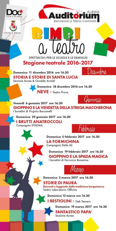L’edizione 2016/2017 dell’attesissima rassegna domenicale per famiglie - BIMBI A TEATRO - aprirà domenica 11 dicembre con la nuova gestione affidata a DOC SERVIZI con la direzione artistica di Tiziana Pirola