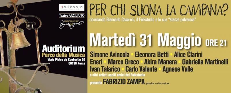 Martedì 31 maggio 2016, alle ore 21:00, sul palco del Teatro Studio dell’Auditorium Parco della Musica di Roma, verrà presentato il Primo Concerto di “PER CHI SUONA LA CAMPANA”. Dieci talentuosi cantautori saranno accompagnati da racconti, ricordi e note musicali legate allo storico Folk Studio.