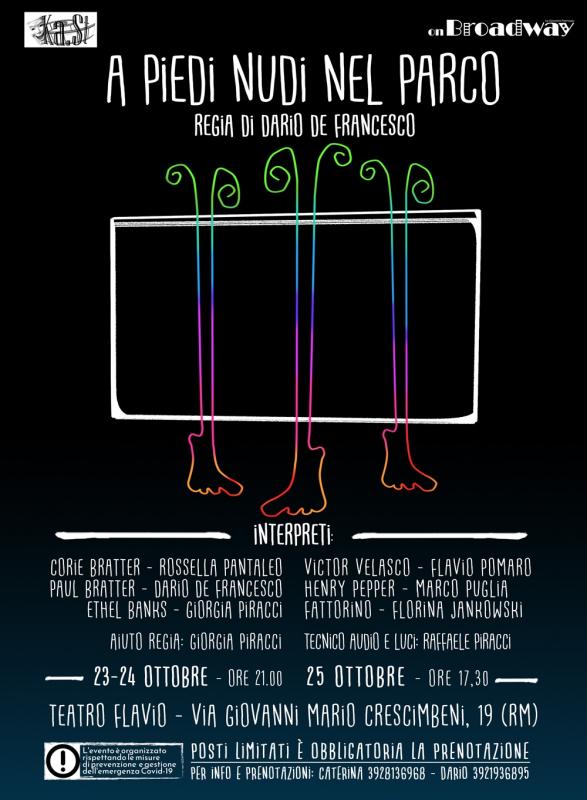 Va in scena dal 23 al 25 ottobre al Teatro Flavio, A PIEDI NUDI NEL PARCO, commedia teatrale di Neil Simon del 1963 (del 1967 la versione cinematografica con Robert Redford e Jane Fonda), diretta da Dario de Francesco e interpretata da Rossella Pantaleo, Dario de Francesco, Flavio Pomaro, Giorgia Piracci, Marco Puglia, Florina Jankowski.