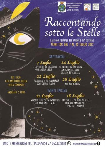 La rassegna, prima e a tutt’oggi unica nella provincia BAT, è un appuntamento importante, che da quindici anni educa i più piccoli alla fruizione del teatro, ma rappresenta anche un prezioso punto di riferimento dal punto di vista sociale, perché offre un’opportunità di condivisione tra adulti e bambini, fondata su un progetto artistico e culturale d’eccellenza. La caratteristica principale che contraddistingue “Raccontando sotto le stelle” risiede in una ricca programmazione, in cui si alternano in modo equilibrato sia spettacoli di teatro d’attore che spettacoli di teatro di figura (burattini, teatro d’ombre, teatro di carta e teatro d’oggetti), offrendo molteplici stimoli narrativi e visivi, capaci di accontentare target e gusti diversi e di rivestire un compito insostituibile nella formazione di spettatori preparati, consapevoli, che costituiranno il pubblico adulto di domani.