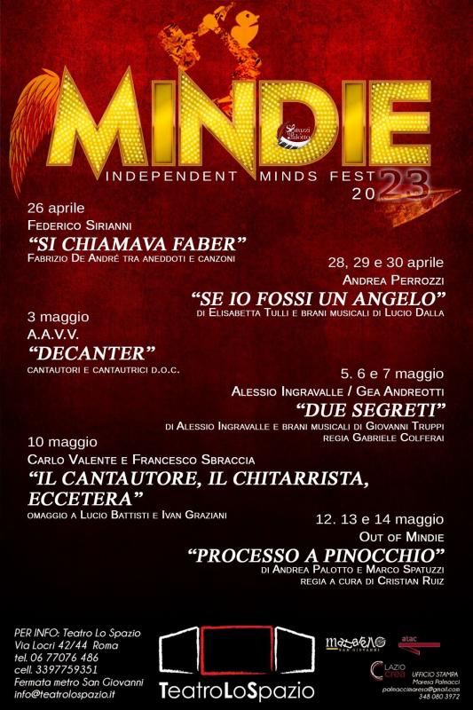 Ritorna a Roma al Teatro Lo Spazio, dal 26 aprile al 14 maggio, la nuova edizione del Mindie – Independent Minds Fest 2023, rassegna di Musical Off a cura di Andrea Palotto e del direttore artistico del Teatro Lo Spazio Manuel Paruccini.