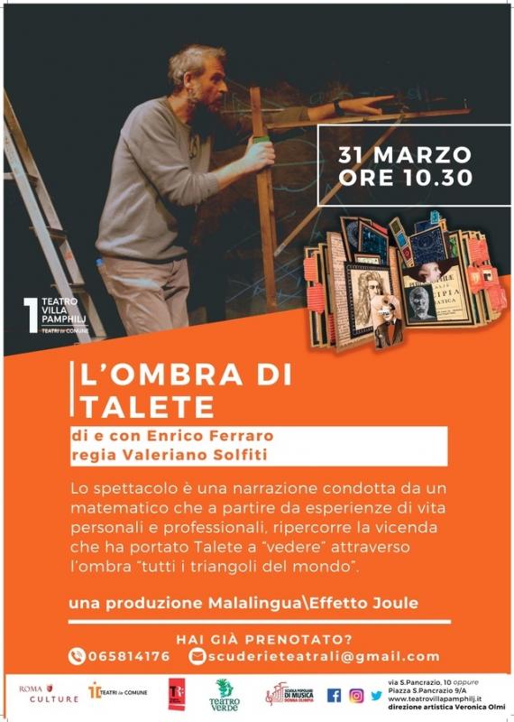 Attraverso il racconto immaginato e teatralizzato, il fisico matematico Enrico Ferraro, a partire da esperienze di vita personali e professionali, ripercorre la vicenda che ha portato Talete a vedere attraverso l’ombra “tutti i triangoli del mondo” e la storia di una grande scoperta matematica diventa scintilla e pretesto per avvicinare all’idea di concetto astratto e alla capacità di immaginare l’invisibile che contraddistingue da sempre i grandi scienziati, capaci di scoprire teorie, fattori ed elementi che magari verranno comprovati sperimentalmente decenni e decenni dopo.