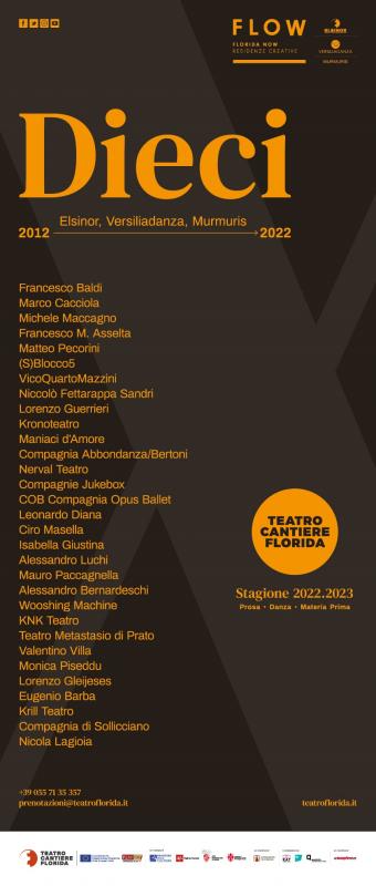 Spegne dieci candeline il Teatro Cantiere Florida, officina creativa rinata nel 2012 come multiresidenza con il nome FLOW (Florida Now Residenze Creative), primo progetto di questo tipo sulla città di Firenze promosso dalle tre realtà che ne condividono gli spazi: Elsinor Centro di produzione teatrale, Murmuris e Versiliadanza. Per celebrare sarà proprio “Dieci” il tema della stagione 2022/2023, omaggio a un esperimento riuscito, quello di unire in un'unica programmazione tre compagnie con un obiettivo comune: ricostruire il rapporto tra teatro e territorio attraverso la creazione di un continuo dialogo col pubblico, tra cultura e comunità.