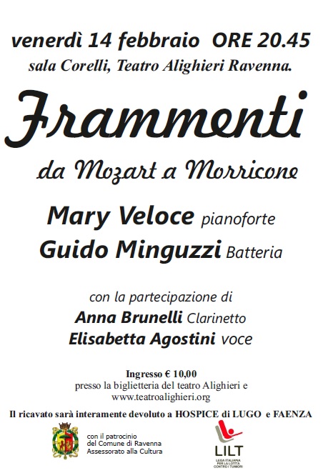 Il concerto è reso possibile dalla generosità e dall'impegno della pianista Mary Veloce, animatrice, assieme alla dr.ssa Patrizia Maioli, della serata, dell'Ass. dr.ssa Elsa Signorino, che ha confermato il pieno sostegno alla LILT ospitando gratuitamente il concerto nella splendida sala Corelli e del dr. Luigi Montanari responsabile delle cure palliative e degli hospice di Ravenna, Faenza e Lugo a cui è destinato l'utile della serata. Oltre a Mary Veloce la serata sarà allietata da Guido Minguzzi, batteria, con la partecipazione di Anna Brunelli, clarinetto e di Elisabetta Agostini, voce.