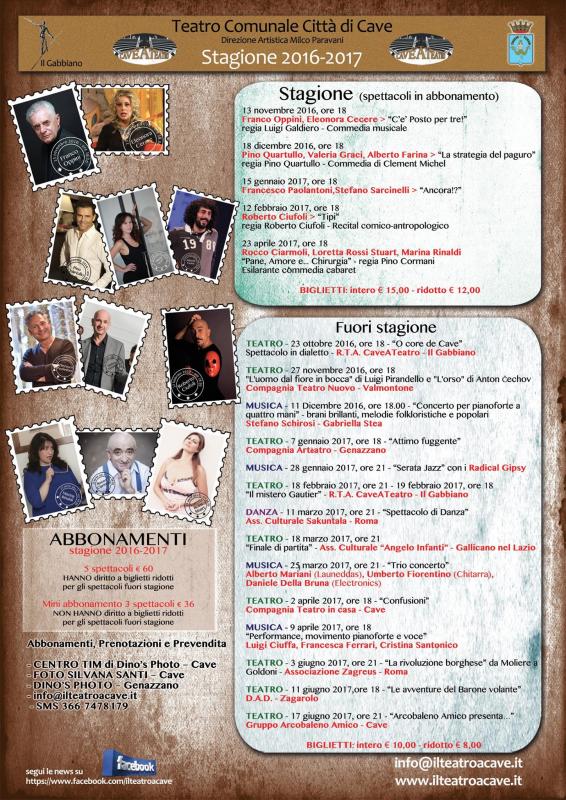L'Associazione CaveAteatro - Il Gabbiano, in collaborazione con Cavesja, l'Arcobaleno Amico, il Centro Comunale Anziani, apre la Terza Stagione Teatrale con una serata interamente dedicata a Cave. Musica, poesie, mostre, sketch, storie, video, il dialetto, una carrellata di risate ed emozioni per rendere omaggio alla nostra città. Per chi vorrà, alla fine della kermesse, sarà possibile degustare una cena organizzata da "Kaos" bar, nella meravigliosa cornice del Parco della Villa Clementi.