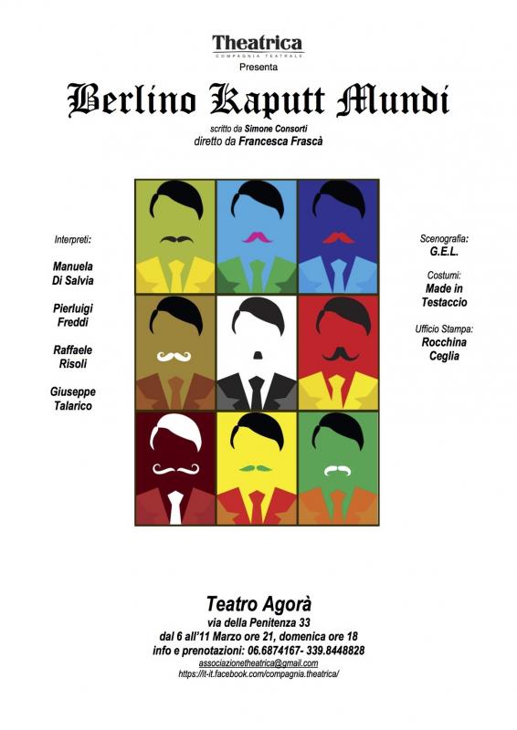Come dobbiamo immaginarlo un Hitler sopravvissuto alla guerra, con sulle spalle le fatiche dell’invecchiamento e del conflitto? È da questa domanda che prende il via Berlino Kaputt Mundi il testo di Simone Consorti. Lo spettacolo diretto da Francesca Frascà vede in scena Manuela Di Salvia, Pierluigi Freddi, Raffaele Risoli, Giuseppe Talarico al Teatro Agorà dal 6 all'11 marzo.