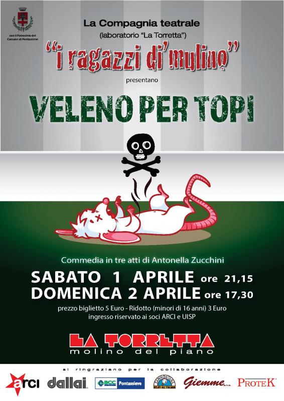 Sabato 1 aprile alle ore 21.15 e Domenica 2 alle ore 17.30, andrà in scena presso il circolo “La Torretta” di Molino del Piano, la commedia teatrale di Antonella Zucchini “Veleno per Topi”. Lo spettacolo teatrale, con testi in dialetto fiorentino, sarà messo in scena dalla compagnia teatrale “I ragazzi di’ Mulino”, compagnia teatrale composta interamente da ragazzi fra gli 8 ed i 16 anni. Il costo del biglietto sarà di 5 euro per gli adulti e di 3 euro per i minori di 16 anni.