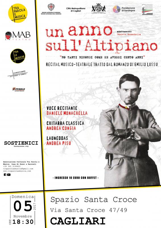 Le pagine dell’opera Un Anno sull’Altipiano, cronaca delle esperienze di guerra di Emilio Lussu, saranno protagoniste del penultimo appuntamento cagliaritano della rassegna SIGNIFICANTE 2017 - SEGNI E SIMBOLI, svoltasi tra i mesi di Aprile e Novembre nel quartiere storico di Castello. Domenica 5 Novembre 2017 alle ore 18:30, lo Spazio Santa Croce (Via Santa Croce 47/49) diventerà il palco del recital di teatro e musica della compagnia Mab Teatro, in cui le memorie del Capitano Lussu saranno rievocate dalle note della chitarra di Andrea Congia, dai suoni delle launeddas di Andrea Pisu e dalla voce dell’attore Daniele Monachella.