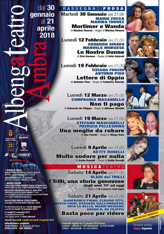 Al via il 30 gennaio 2018 la rassegna teatrale AlbengAteatro 2018 al Teatro Ambra di Albenga (SV), con sette spettacoli in scena fino al 21 aprile 2018.