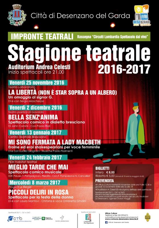 All'Auditorium Celesti di Desenzano del Garda dal 25 novembre 2016 all'8 marzo 2017 va in scena la stagione teatrale invernale, con inizio spettacoli alle ore 21.