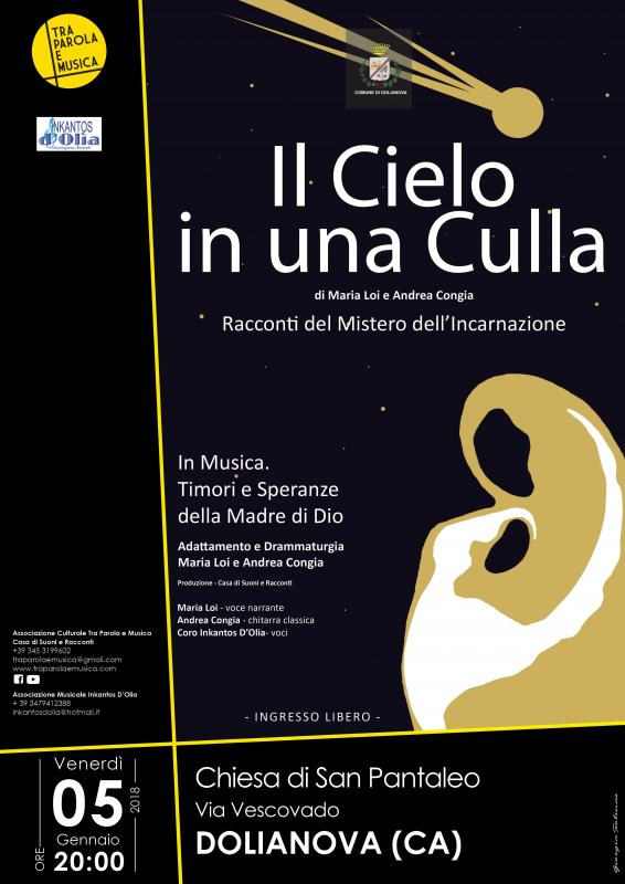 Nuovi appuntamenti sono previsti per lo spettacolo Il Cielo in una Culla nei giorni prossimi all’Epifania 2018. Venerdì 5 Gennaio la Chiesa romanica di San Pantaleo (XII-XIII secolo) di Dolianova diverrà uno splendido scenario per lo spettacolo-concerto che, in questa prestigiosa occasione che apre l’anno della Casa di Suoni e Racconti, si avvarrà del contributo artistico del Coro Inkantos D’Olia, diretto dal Maestro Boris Smocovich. I canti natalizi e di tradizione mariana proposti dal Coro saranno incastonati all’interno dello Spettacolo a conclusione di ogni quadro narrativo. Alle ore 20:00, all’interno della Chiesa, attorniati dagli affreschi medievali, l’attrice Maria Loi e il musicista e compositore Andrea Congia racconteranno, tra Parola e Musica, la vita e le scelte di Maria di Nazareth: dalla sua nascita alla presentazione al Tempio, terminando con la nascita di Gesù e la fuga in Egitto. La storia di Maria è un percorso narrativo che vuole far emergere la sua straordinaria adesione al Progetto Divino, un Atto di Fede che va oltre gli umani timori. Lo spettacolo è organizzato dall’Associazione Culturale Tra Parola e Musica con il patrocinio del Comune di Dolianova.