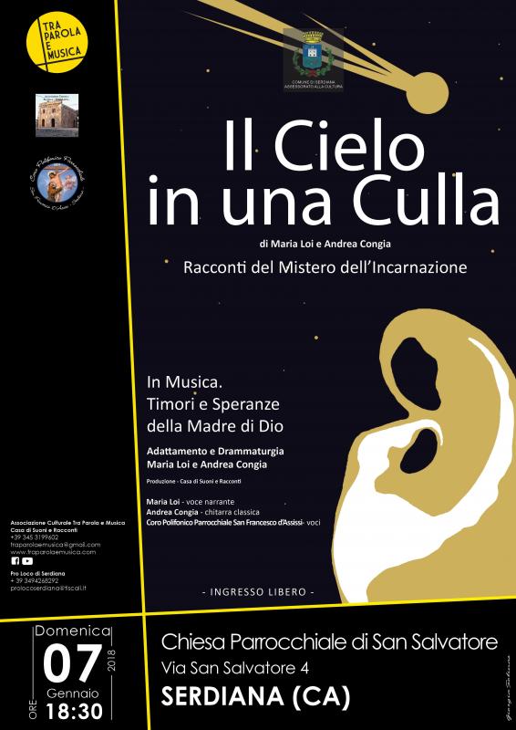 Per l’Epifania 2018 il Comune di Serdiana e, in particolar modo, l’Assessorato alla Cultura propongono alla Comunità lo spettacolo Il Cielo in una Culla. Domenica 7 Gennaio 2018 nella Chiesa di San Salvatore, alle ore 18:30, l’attrice Maria Loi e il musicista e compositore Andrea Congia racconteranno, tra Parola e Musica, la vita e le scelte di Maria di Nazareth all’interno del percorso narrativo che vuole far emergere la sua straordinaria adesione al Progetto Divino, un Atto di Fede che va oltre gli umani timori. In questa occasione, i canti di tradizione natalizia e mariana del Coro Polifonico Parrocchiale San Francesco d’Assisi saranno incastonati all’interno dello spettacolo-concerto a conclusione di ogni quadro narrativo: dalla nascita di Maria, alla presentazione al Tempio, terminando con la nascita di Gesù e la fuga in Egitto.