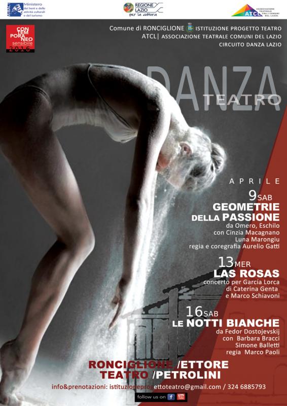 Mercoledì 13 aprile, protagonista sarà il genio immortale di Garcia Lorca, al quale si ispira lo spettacolo di danza-concerto Las Rosas, di Caterina Genta e Marco Schiavoni mentre sabato 16 aprile sarà la volta di una prima nazionale, Le Notti Bianche, ispirato dal romanzo di Fedor Dostojevskij, con Barbara Bracci e Simone Balletti.