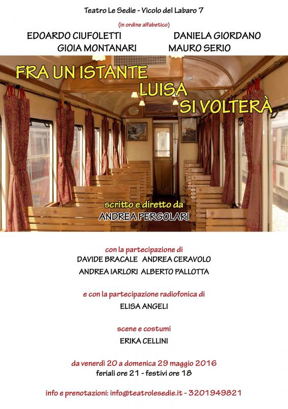 Fra un istante Luisa si volterà. É questo il titolo del nuovo testo scritto e diretto da Andrea Pergolari. Dopo il successo di Sabina, l'autore, nonché direttore artistico del Teatro Le Sedie di Roma, porta in scena dal 20 al 29 maggio (dal venerdì alla domenica), proprio nel teatro del quartiere Labaro, un nuovo racconto. Sul palco Edoardo Ciufoletti, Daniela Giordano, Gioia Montanari, Mauro Serio con la partecipazione di Davide Bracale, Andrea Ceravolo, Andrea Iarlori, Alberto Pallotta e con la partecipazione radiofonica di Elisa Angeli.