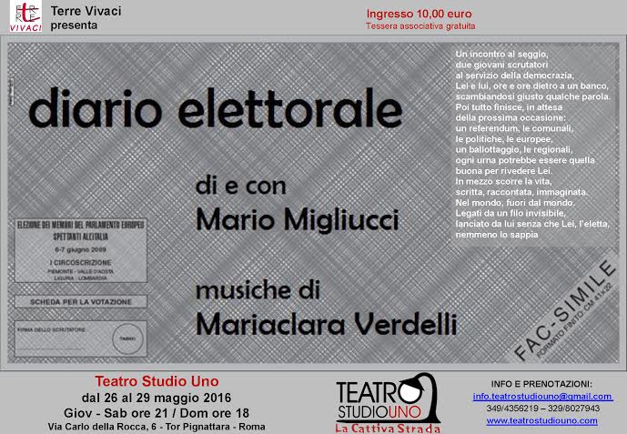 Nel pieno della campagna elettorale che sta vivendo in questi giorni la città eterna, dal 26 al 29 maggio arriva al Teatro Studio Uno “Diario elettorale” spettacolo scritto, diretto e interpretato da Mario Migliucci accompagnato dalle musiche dal vivo di Mariaclara Verdelli, che racconta con ironia e delicatezza di votazioni, urne, scrutini e ballottaggi intrecciando politica, sentimenti e senso civico.