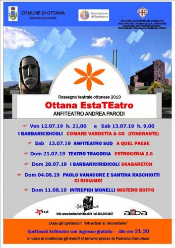 Prende avvio venerdì 12 luglio la nuova edizione (la VI quest’anno) di Ottana EstaTEatro, la rassegna teatrale ottanese organizzata dalla locale Compagnia I Barbariciridicoli, realizzata grazie all’importante sostegno dell’Assessorato alla Cultura del Comune di Ottana, che, insieme all’Assessorato alla Cultura della Regione Sardegna e alla Fondazione di Sardegna, contribuiscono alla manifestazione, consentendone anche il suo svolgimento interamente gratuito.