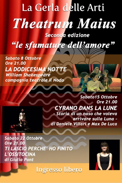 Il mese di ottobre vede il ritorno di “Theatrum Maius”, la rassegna teatrale organizzata dall’associazione culturale “La Gerla delle Arti”, in programma al Teatro Cinema Colonna di via Chiusure.