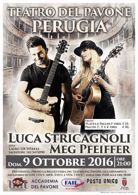 Una voce, due cuori, e tante chitarre domenica 9 ottobre al Teatro del Pavone di Perugia. A partire dalle 21, infatti, la coppia formata da Luca Stricagnoli e Meg Pfeiffer, talentuosi giovani artisti internazionali, si esibirà in un concerto che promette di stupire il pubblico perugino.