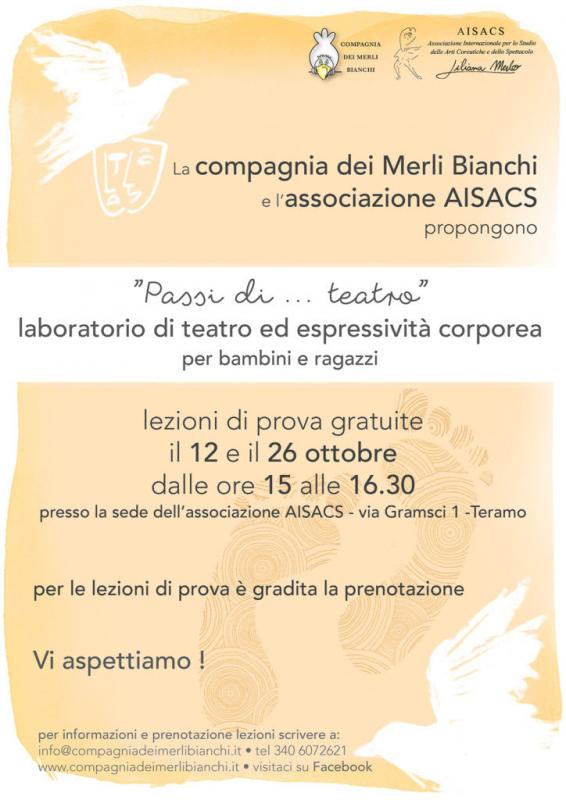 TERAMO – La Compagnia dei Merli Bianchi inaugura la prima edizione dei propri laboratori teatrali per bambini e ragazzi a Teramo. I corsi – organizzati in collaborazione con l’Aisacs (Associazione internazionale per lo studio delle Arti Coreutiche e dello Spettacolo "Liliana Merlo") – si terranno nella sede dell’associazione intitolata all’indimenticata maestra di danza italo-argentina Liliana Merlo.