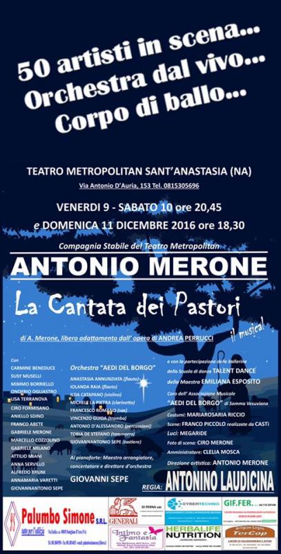 Esilarante rappresentazione pastorale, "La Cantata dei pastori" verrà messa in scena dalla compagnia stabile del Teatro Metropolitan di Sant'Anastasia diretta da Antonio Merone, con la regia di Antonino Laudicina venerdì 9 dicembre, sabato 10 e domenica 11. Questa grande opera sacra nasce verso la fine del '600 e il suo primo autore fu Andrea Perrucci che la pubblico' nel 1698. Numerosi i rifacimenti e le versioni ma sempre magica ed emozionante racconta le vicissitudini di Maria e Giuseppe nel loro viaggio verso Betlemme e le insidie dei diavoli che vogliono a tutti i costi impedire la nascita di Gesù I diavoli periranno però, per mano dell'angelo Gabriele che difenderà con tutte le sue forze la sacra famiglia. Tra pastori, pescatori e tanti altri personaggi spiccheranno Razzullo e Sarchiapone che con la loro simpatia daranno quel tocco di napoletanità che renderà unica l'opera.