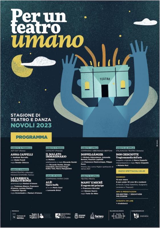 Sette spettacoli di teatro e danza per ritrovarsi, farsi comunità, riappropriarsi di una dimensione umana che spesso ci sfugge: dal 18 febbraio al 22 aprile (ore 20:45 - ingresso 10/8 euro - prevendite su vivaticket.it - info e prenotazioni 3208607996 - 3403129308 - 3290474358) il Teatro Comunale di Novoli, in provincia di Lecce, ospita "Per un teatro umano". «Riconoscersi nelle vite degli altri, di quei personaggi che abitano la scena, attraversare le loro vite e fare nostre le loro emozioni: solitudine, dolore, scoperta, assenza, gioia, divertimento», si legge nell'introduzione alla stagione promossa da Factory Compagnia Transadriatica e Comune di Novoli con il sostegno di Ministero della Cultura, Regione Puglia e Teatro Pubblico Pugliese in collaborazione con BlaBlaBla nell'ambito dell'articolato progetto Teatri del Nord Salento. Il programma prenderà il via sabato 18 febbraio con "Anna Cappelli" di Annibale Ruccello della compagnia Aut-Out di Roma con Giada Prandi, le musiche di Stefano Switala per la regia di Renato Chiocca. "Per un teatro umano" proseguirà con "La Fabbrica degli stronzi" di Maniaci d’Amore e Kronoteatro (sabato 4 marzo), "Il malato immaginario" della compagnia fiorentina Catalyst (sabato 11 marzo), "Alé!" di Maria Cassi e Leonardo Brizzi (sabato 25 marzo), "Doppelganger" della Compagnia Abbondanza Bertoni, Premio Ubu come Miglior spettacolo di danza 2021 (sabato 1 aprile), "Manù e Michè - Il segreto del principe" della compagnia Teatro Pirata (Sabato 15 aprile) e "Don Chisciotte" di Stivalaccio Teatro (sabato 22 aprile). «Attraverseremo testi classici e nuovi autori, ci faremo accompagnare dall’esperienza trentennale di alcune compagnie così come dalla freschezza coraggiosa di giovani artisti. Esplorando i registri dell’ironia e del dramma, indagheremo gli spazi sconfinati dell’animo umano con uno sguardo sul reale che si rivolge severo e cinico alla contemporaneità così come a storie senza tempo», sottolinea il direttore artistico Tonio De Nitto. «Un concerto di linguaggi accompagnerà questa nostra avventura: dalle più tradizionali tecniche della commedia dell’arte ai più innovativi dispositivi tecnologici, dal lavoro di cesello dell’attore alle immense potenzialità della danza».