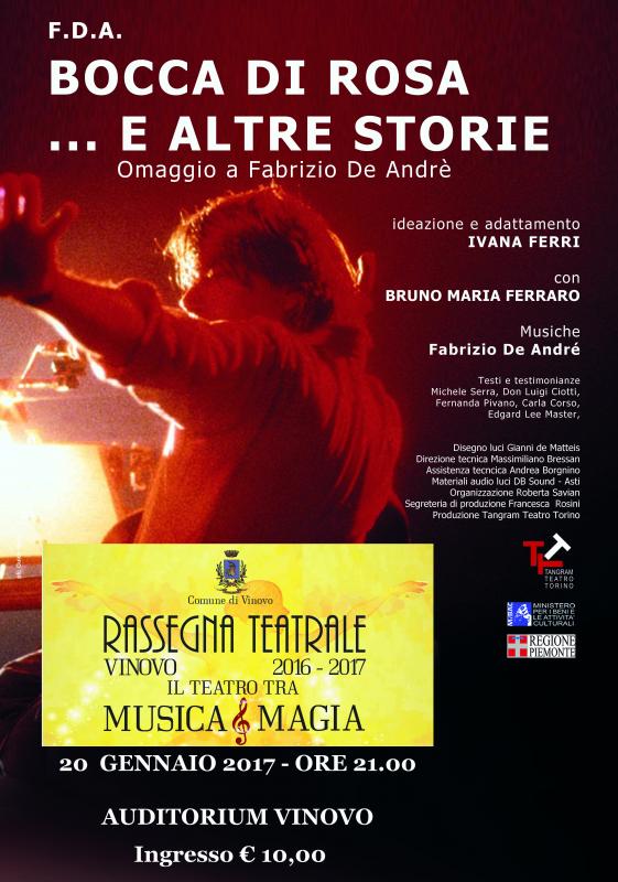 Ci siamo chiesti molte volte come mai uno spettacolo di canzoni che entrano in un contesto teatrale abbia avuto così lunga durata. FDA BOCCA DI ROSA E ALTRE STORIE “gira” per teatri italiani e stranieri dal 1999, è diventato un piccolo caso di cui si sono occupati più volte i giornali. Le ragioni sono tante, ma per noi la cosa importante è che, dopo 16 anni dalla scomparsa di questo “amico fragile”, tante persone continuino ad aver voglia di condividere storie, di lasciarsi trasportare da un’onda emotiva lunga dove fa piacere rincontrare Marinella, il suonatore Jones, Suzanne, Francis Turner, Bocca di Rosa, l’illuso di Via del Campo, le spose bambine di Khorakhane. FDA BOCCA DI ROSA E ALTRE STORIE non è una storia che svanisce dopo averla raccontata è il piacere sottile di rincontrare persone e personaggi conosciuti nel tempo e con loro condividere, ancora una volta un’emozione, una rabbia, un sorriso.