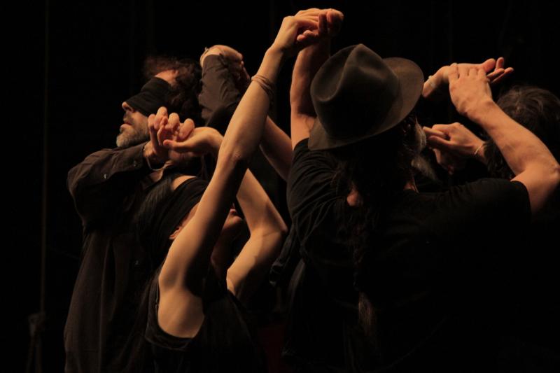 Abbiamo così costruito il nostro percorso su di una struttura coreografica martellante. Ci siamo accorti, quasi inconsciamente, che stavamo ballando una specie di giga, che è poi una danza-girotondo ripetitiva e ossessiva: sul suo ritmo ipnotico e insistente, abbiamo liberato quelle forme sulle quali si sono poi potuti inerpicare i nostri personaggi. Così è successo che abbiamo provato a chiudere gli occhi per vedere meglio e agito quell' incessante moto per sentire più forte.