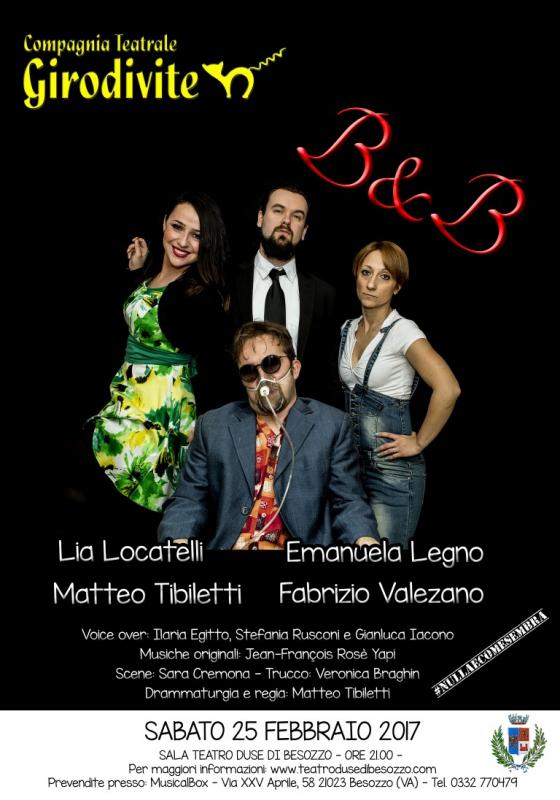 E' fissato per il 25 Febbraio 2017, presso il teatro Duse di Besozzo, il debutto assoluto per il nuovo spettacolo della compagnia teatrale Girodivite: "B&B", scritto e diretto dal varesino Matteo Tibiletti.Tanti i temi trattati in questa commedia, a tratti cinica e irriverente, a tratti commovente e malinconica: su tutti, la violenza contro le donne e l'ambiguità dell'essere umano.