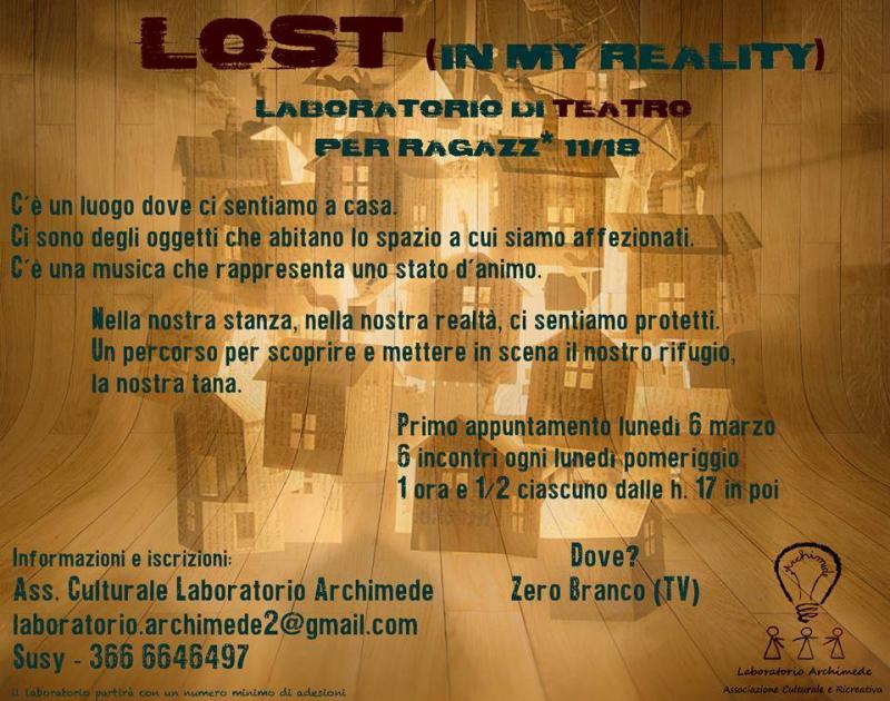 Da questi presupposti nasce la ricerca artistica Lost (in my reality), dedicata alla messa in scena delle nostre "camerette" come riflesso di quel vasto e complesso universo che si chiama "io", ricco di sogni, di opportunità di crescita e di nuove esperienze ma anche di fragilità, conflitti e difficoltà.Il percorso utilizza diversi linguaggi artistici, dal teatro, al movimento, all'interazione con la musica. Il vero lavoro di ricerca sarà condotto dai partecipanti, che analizzeranno, penseranno e poi esporranno quelli che sono gli oggetti, le musiche i colori, le sensazioni che contraddistinguono il loro spazio. A termine del percorso ci sarà una restituzione aperta del lavoro, dove in scena ci saranno le stanze dei partecipanti in una installazione performativa che farà da ponte dalla dimensione interna a quella esterna.