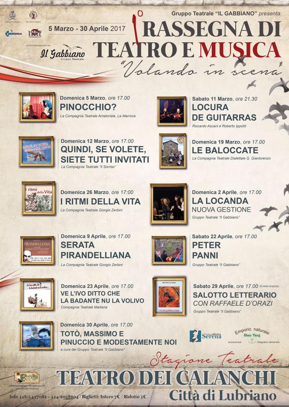 Avvolti da suggestive valli, dinanzi al dolcemente drammatico paesaggio di Civita di Bagnoregio, " La città che muore ", nella tranquillità dei borghi di Lubriano al Teatro dei Calanchi, il gruppo teatrale " Il Gabbiano " dà vita ad una kermesse di due mesi, marzo ed aprile, durante i quali si alterneranno piece teatrali e spettacoli musicali di fantasiosi personaggi con un grande comune denominatore, la passione per l' arte in tutte le sue forme. Dal teatro dialettale, alla commedia musicale, dalla magia del flamenco, alla musica ricercata di un visionario dei giorni nostri. Insomma, un grande quadro di sogni. La rassegna si propone, con i suoi spettacoli, di far conoscere il pensiero di un gruppo di artisti che credono che un sorriso possa cambiare il mondo e alla fine si concluderà con un omaggio a tre grandi artisti del passato che ancora vivono nei cuori di chi ama l' arte: Totò, Massimo Troisi e Pino Daniele con lo spettacolo del Gruppo Teatrale " Il Gabbiano ": " Totò, Troisi, Pinuccio e modestamente noi. "