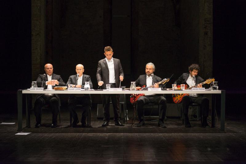 “Questa lapide – racconta Luigi Dadina – ha iniziato a parlarmi, a dirmi che era giunto il momento di occuparsi di lavoro, di fabbriche, di incidenti, che ero io la persona giusta per farlo. La struttura dello spettacolo è quella di una conferenza, certo una conferenza sui generis, con tutti, attori e musicisti, dietro a un lungo tavolo, ognuno coi propri strumenti, ognuno col suo vero nome, ognuno un po’ sopra le righe. Si tratta di uno spettacolo complesso, che non c’entra col ‘teatro civile’”.