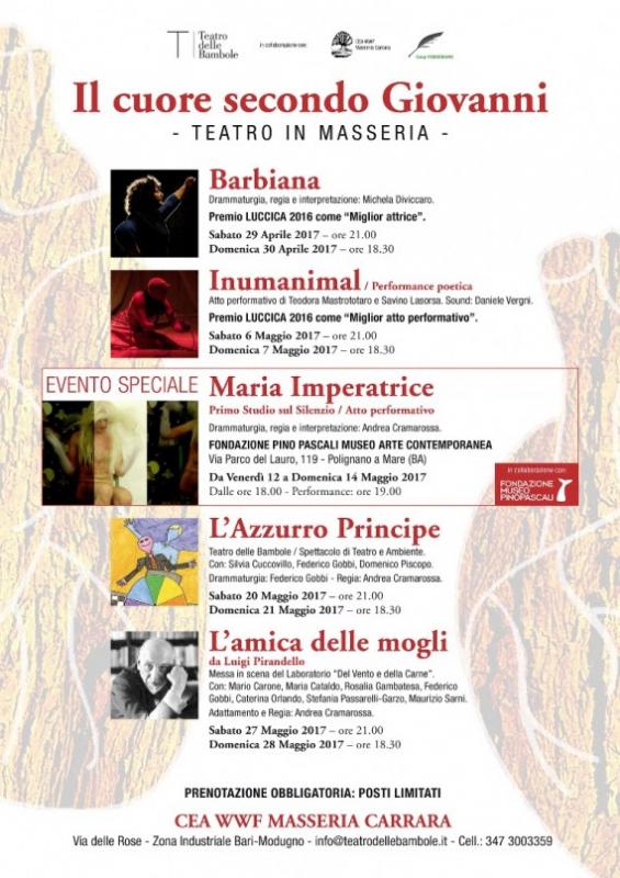 Da un’idea di Andrea Cramarossa, Direttore Artistico del gruppo di ricerca teatrale Teatro delle Bambole, nasce la Rassega “Il cuore secondo Giovanni - Teatro in Masseria”.